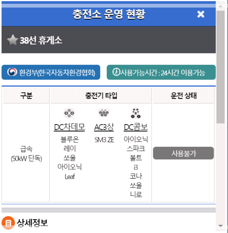 검색 후 해당 휴게소 정보를 눌러보시면 충전기 타입부터 종류, 현황까지 한 번에 확인하실 수 있습니다.