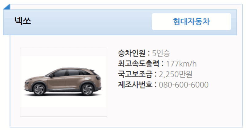 넥쏘 보조금이 지급 대상인지를 확인하시는 게 가장 먼저인데요. 아래를 통해서 수소자동차 넥쏘가 보조금 지급 대상을 확인하실 수 있습니다. 보시다시피 국고보조금은 2,250만 원인 것을 확인하실 수 있습니다.